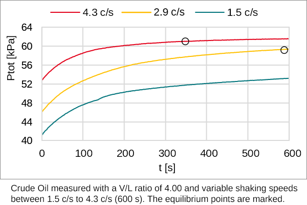 Crude oil properties like viscosity play an important role in vapor pressure measurements. As a higher viscosity significantly delays the formation of a pressure equilibrium, shaking of the measuring cell is mandatory for ASTM D6377. ERAVAP features a superior cell and shaker design, which allows for a shaking speed of 4.3 cycles per second (red curves), much higher compared to other vapor pressure testers on the market (green and yellow curves). This results not only in a faster measurement but also significantly increases the accuracy and precision. Insufficient shaking or applying a static measuring time can lead to lower values with a bias of up to 10 kPa (1.5 psi).