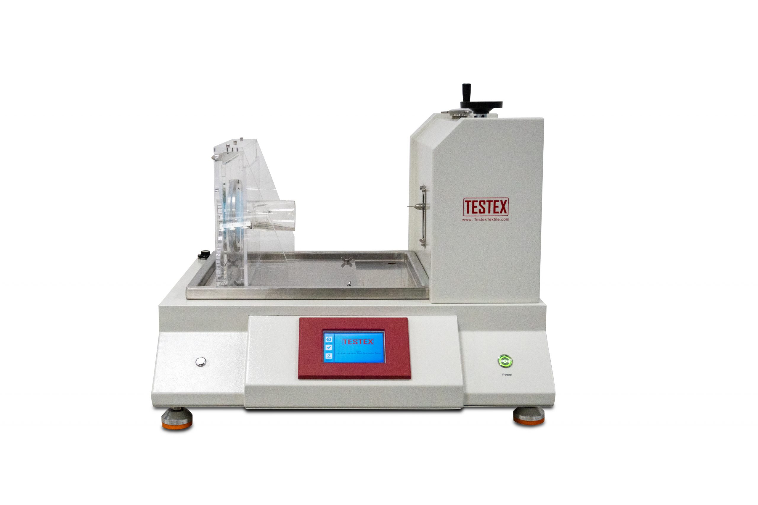 Synthetic blood penetration tester, is used for measuring the resistance of medical face masks and other coated materials to the penetration by a splash of synthetic blood at different pressures, it can conduct the tests of standards like ISO 22609, EN 14683, ASTM F1862, ASTM F2100.