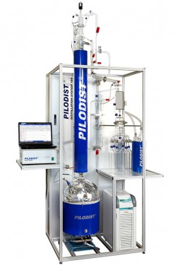 Gentle distillation by temperature controlled oil bath with product circulation. Operation range from ATM down to vacuum.