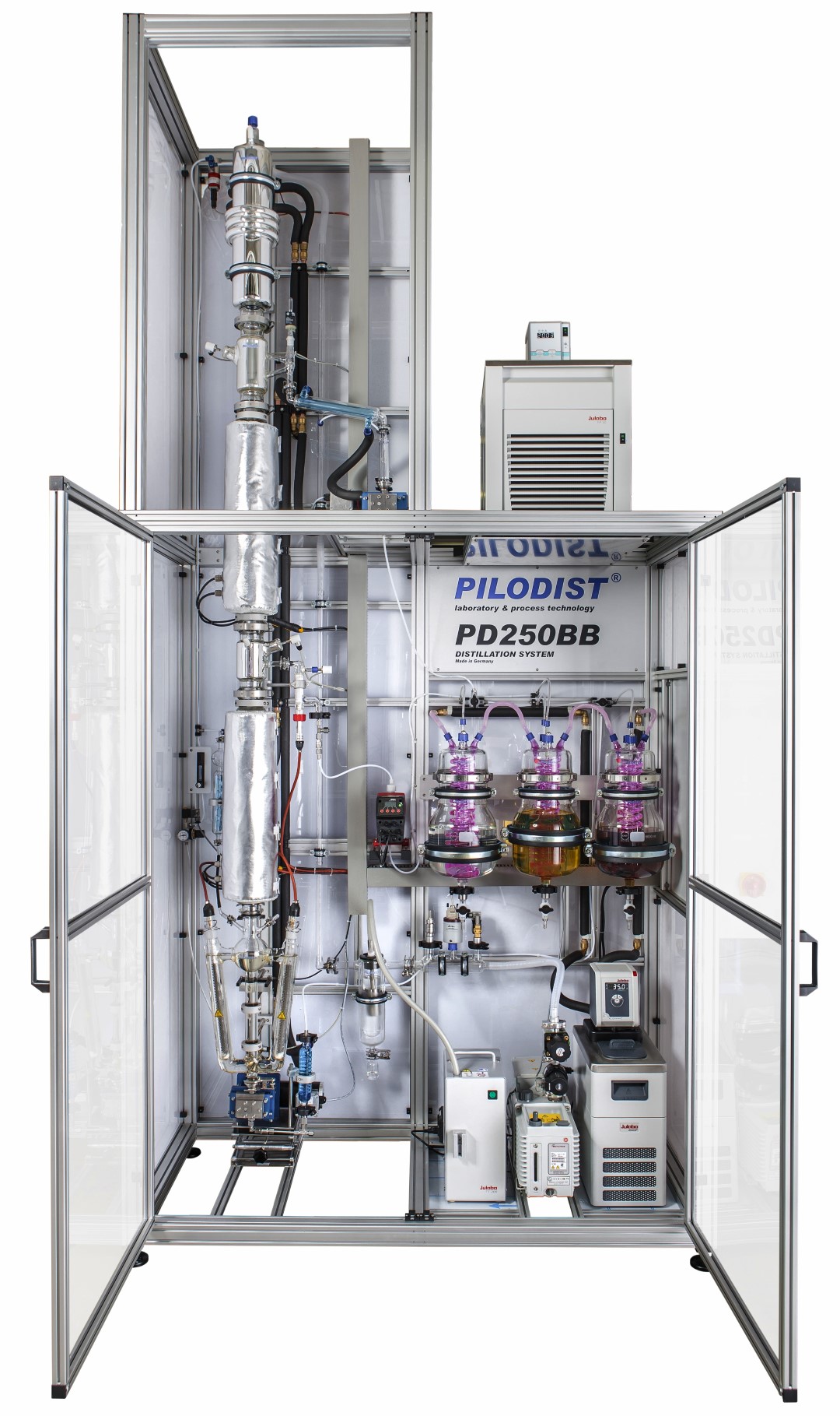 As a safety feature the circulation evaporator is equipped with a dry-up rotection. The individual and fully-automatic PILODIST – control system provides an automatic control of the temperature of the column heating mantles depending on the head temperature or the column-middle-temperature respectively to ensure a fully-adiabatically operation.