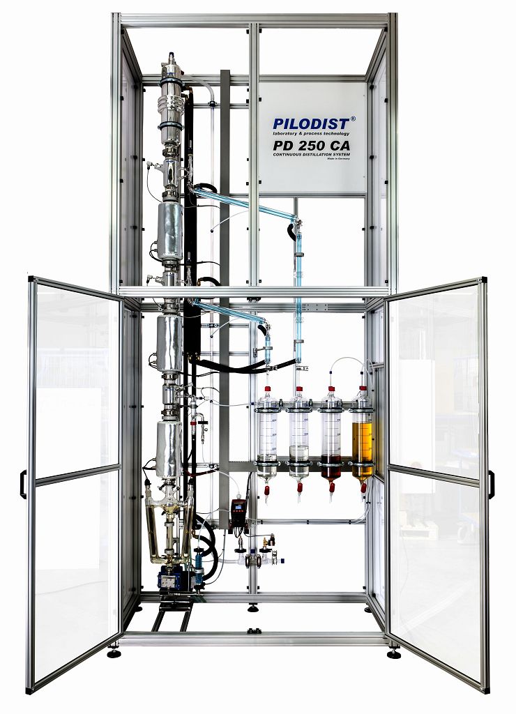 As a safety feature the circulation evaporator is equipped with a dry-up rotection. The individual and fully-automatic PILODIST – control system provides an automatic control of the temperature of the column heating mantles depending on the head temperature or the column-middle-temperature respectively to ensure a fully-adiabatically operation.