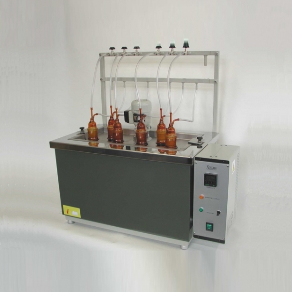 The apparatus, suitable for the execution of the test at 50°C, consists of a steel case containing a stainless steel bath with a four-hole cover for the test tubes and a manifold for connecting water to the condensers.