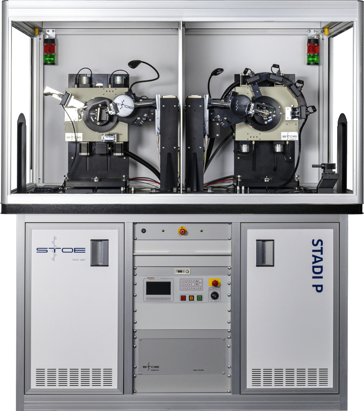 The well-known, high-precision STOE STADI P two circle goniometer is the basis of STOE’s powder diffraction building block system (read more about it here). Vertically or horizontally mounted, the STADI P can be built in Transmission/Debye-Scherrer or Bragg-Brentano geometry. Moreover, two STADI P goniometers, either in the same or different configurations, can be mounted in the same cabinet resulting in two completely independent instruments. However, the two goniometers can also share one source.