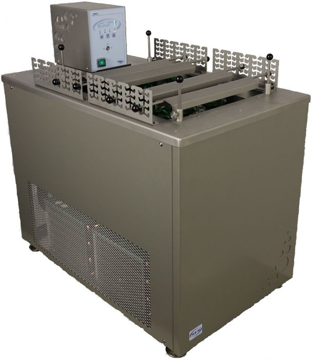The Tamson TLB50 ASTM D7501 cold soak bath is a bath to soak the samples according to ASTM D7501, IP PM EA, CEN N 403 and CGSB 3.0 No. 142.. The bath is equipped with integrated cooling and has a very large capacity to cold soak samples at temperatures ranging from -5°C up to +80°C. The benchtop bath with integrated cooling can replace the combination of a water bath with an external cooling circulator. This not only saves bench space, but also costs because of its high cooling efficiency. The TLB50 can be connected to a PC using the RS232 connection. The PC can control the setpoint temperature. The cold soak bath is equipped with a levelling platform, rack and bottle holders, to prevent the bottles from floating.